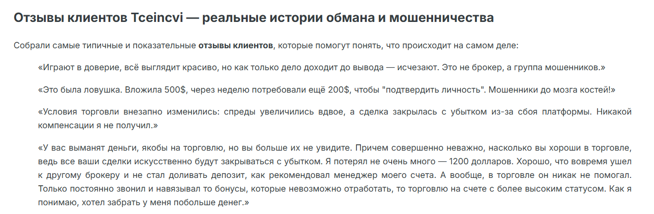 О брокере Tc Cvi отзывы в сети только негативные. Пользователи рассказывают, что платформа создана мошенниками, которые только выманивают деньги из людей. Под различными предлогами менеджеры убеждают пользователей внести средства на счет. Как только дело доходит до вывода средств, мошенники сразу же исчезают. Они перестают отвечать, а в некоторых случаях и вовсе блокируют клиенту доступ к личному кабинету.