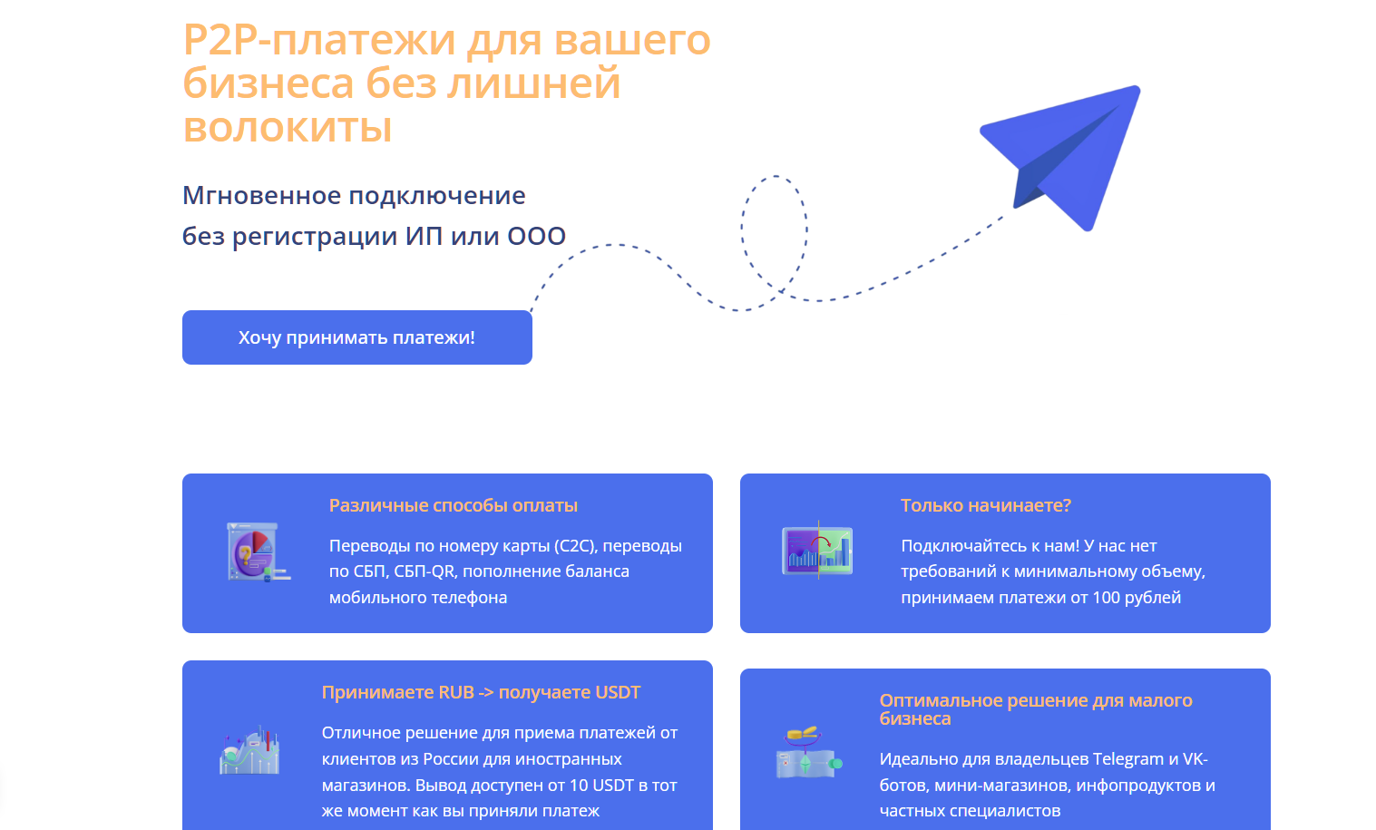 Минимальная сумма оплаты всего 100 рублей. Фирма предлагает вывод средств на криптовалютные кошельки, сопровождение сделок Р2Р между контрагентами без регистрации собственной фирмы как ИП или ООО.