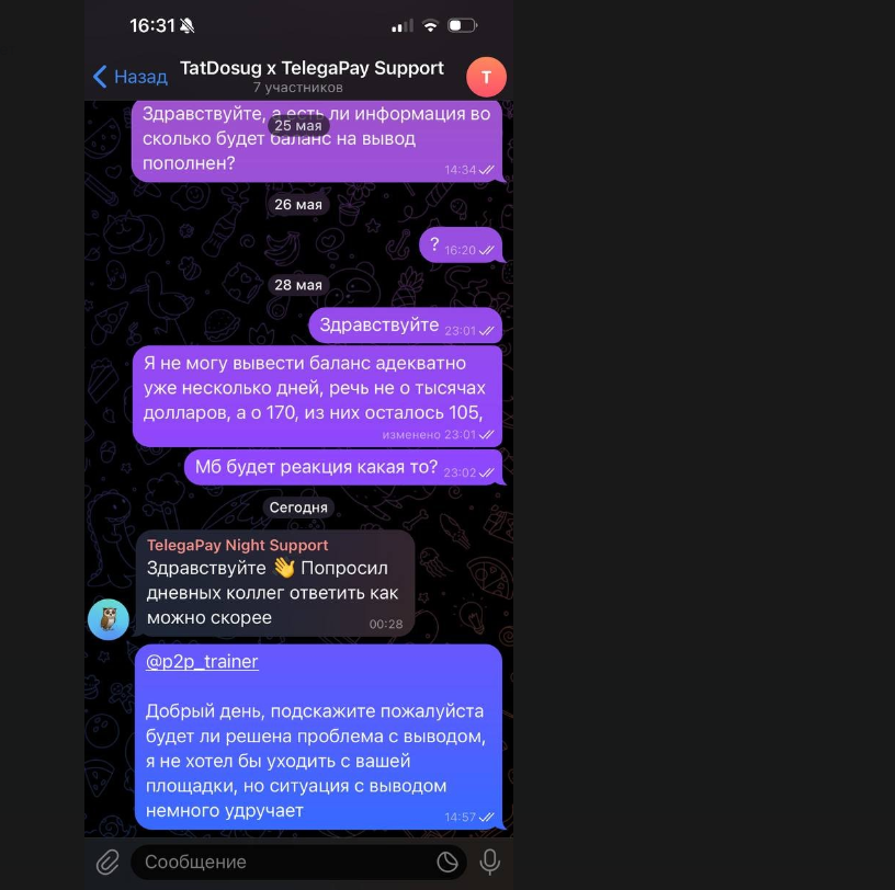 На других ресурсах пользователи софта сообщают, что не могут получить деньги. Платежная система отказывается осуществлять перевод. Потом на сайте отзывов идет спор, в котором администратор сайта «Телегапей» утверждает, что пользователь занимался скамом и его деньги заблокированы.