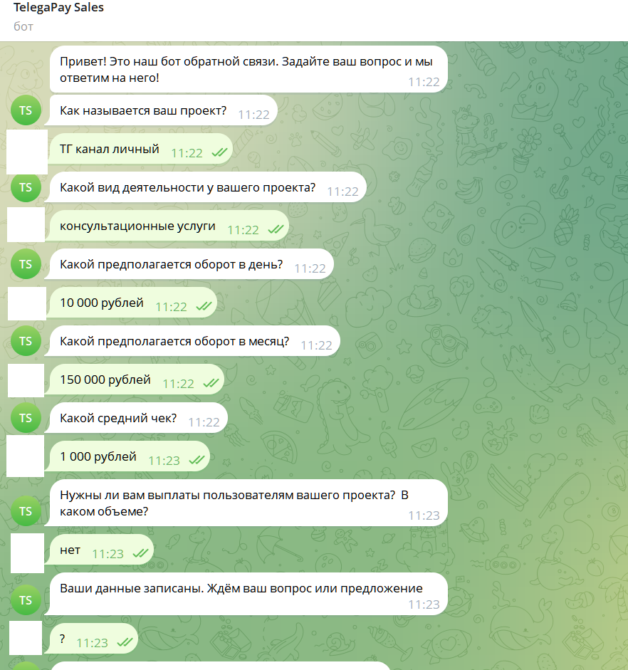Общение с клиентами сервис ведет через ТГ бот и TelegaPay Payments Support. Компания также открыла ТГ канал telegapaynews, на который подписано 47 человек. Для проекта, который существует с 2024 года это небольшая аудитория.