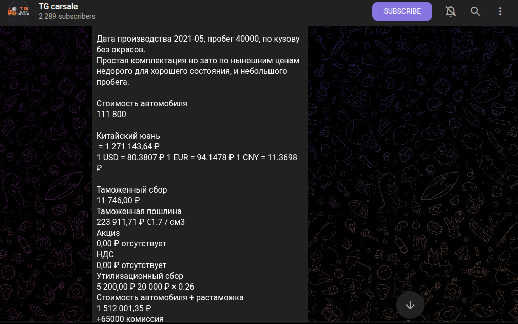 На ТГ-канале «Карсале» команда предлагает разные транспортные средства и комплектующие к ним. Автомобили под ключ, т.е. в список услуг входит приемка, отправка, растаможка и оформление. На данный момент магазин продает автомобиль Volkswagen Tuyue (Tharu) 280TSI two-wheel drive fashion version по цене в 1.6 миллиона рублей. В стоимость входит абсолютно все: акциз, утильсбор, растаможка, комиссии и услуги брокера.
