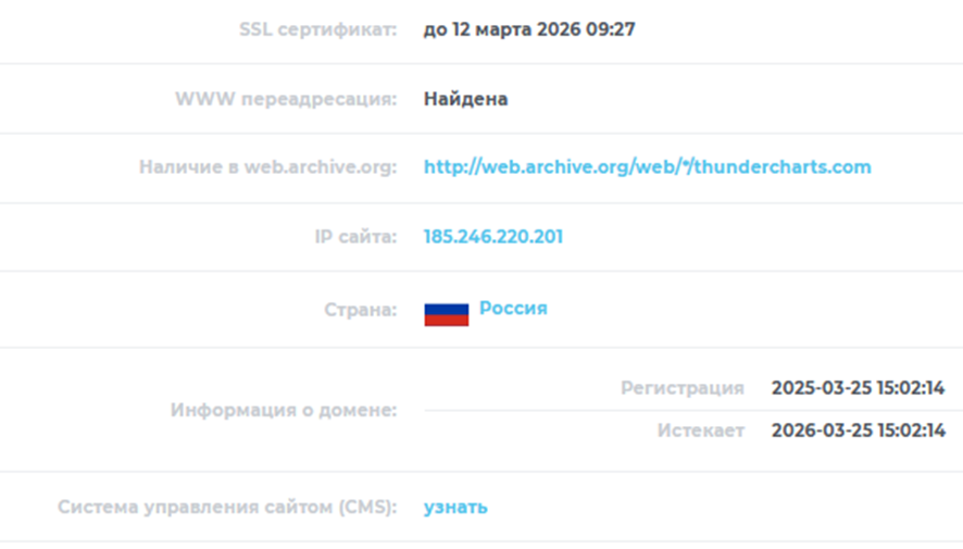 Автор публикации заявил, что проект Thundercharts com, который говорит о себе, как о международной площадке, на самом деле имеет признаки фишингового сайта. Это подтверждают следующие факты: