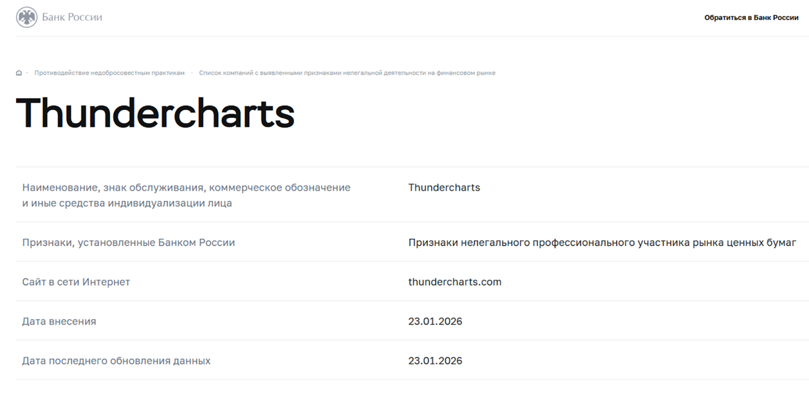 Биржа ThunderCharts 23 января 2026 года внесена в черный список Банка России. Причиной блокировки сайта стали признаки нелегальной деятельности. Потенциальные трейдеры должны обязательно это учитывать, выбирая платформу для торговли.