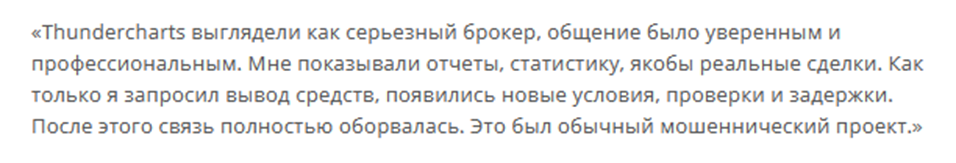 Чтобы убедить клиентов в своей надежности, менеджеры платформы могут демонстрировать отчеты по удачным сделкам. Но такая статистика ничем не доказана, на профильных форумах о бирже Thunder Charts вообще не известно. Как только пользователь оформляет заявку на вывод, появляются новые условия, включая задержки, требования по проверке аккаунта. Заканчивается это одинаково – блокировка счетов и отсутствие связи с менеджером.