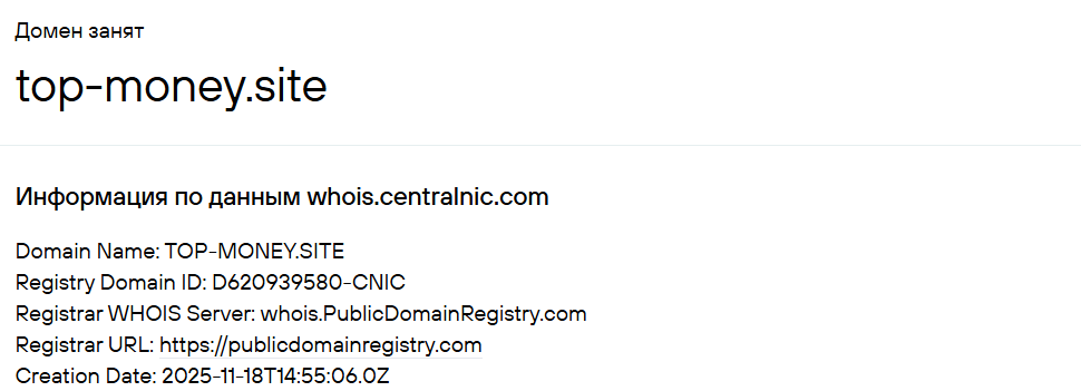 Регистрация площадки в доменной зоне .site произошла в ноябре 2025 года, то есть на 03.12.2025 сервису меньше месяца. При этом на главной странице указано, что проекту 898 дней, что является прямым обманом.