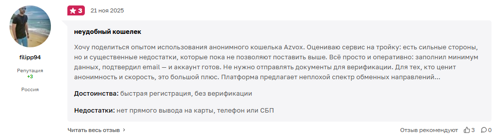 Фонд проекта на 03.12.2025 якобы составляет ₽81,902.06. На сайте есть статистика последних пополнений и выводов – суммы варьируются от ₽1 до ₽118. Для проведения платежей сервис «Топ Мани» предлагает единственная платежную систему – кошелек Azvox. В отзывах на него описываются как сильные, так и слабые стороны. Среди плюсов пользователи выделяют: