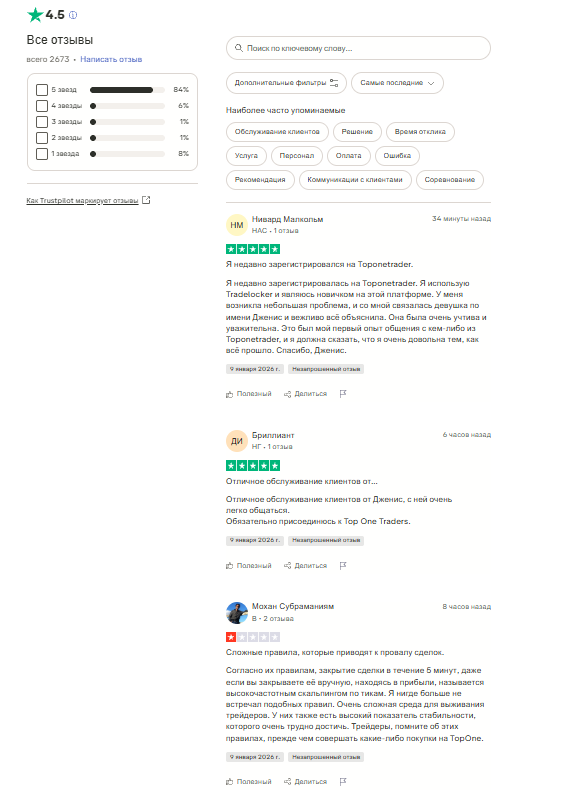 Положительных отзывов о Top One Trader prop больше, так как трейдеры с хорошей стороны описывают свой опыт сотрудничества с организацией. Утверждается, что служба поддержки быстро реагирует на проблемы клиентов и доходчиво объясняет, как работают правила.