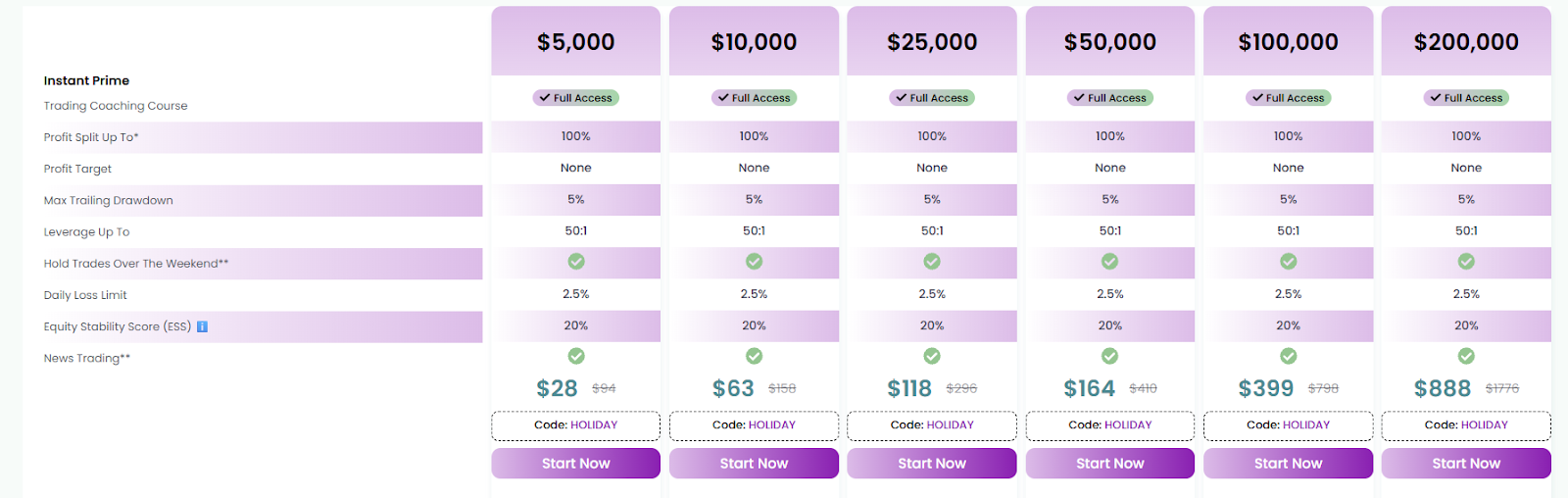 У TopOneTrader нет лимитов по времени прохождения проверки, что позволяет трейдеру торговать в собственном ритме, а тарифы на порядок дешевле, чем у конкурентов. Например, аккаунт с лимитом в $5,000 обойдется в $28, а максимальная сумма для новичка составляет $200,000.