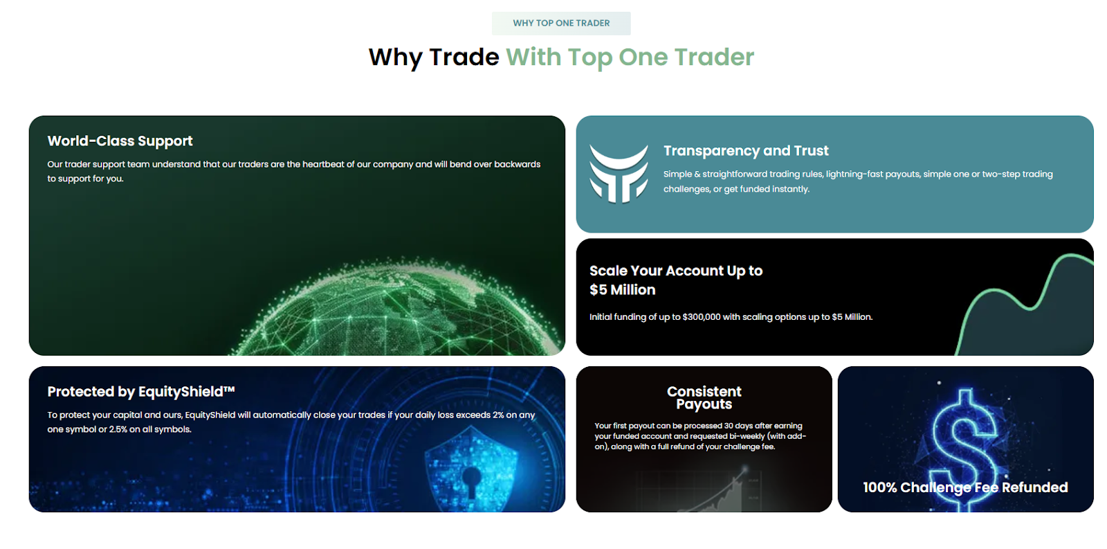 Top One Trader – это компания, предоставляющая трейдерам капитал для торговли на финансовых рынках. Клиенту проекта предстоит проверить свои навыки, после чего он сможет воспользоваться деньгами организации, чтобы не рисковать собственными средствами.