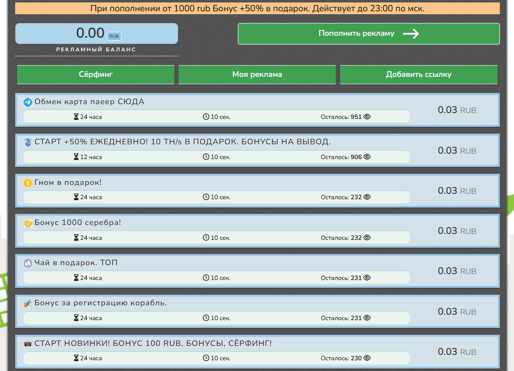 Также клиент может разместить собственные объявления, чтобы получить трафик, количество просмотров можно ограничить. Еще один вариант заработка – это реферальная программа, так как, приглашая других людей, пользователь сможет получить до 10% от его суммы пополнений.