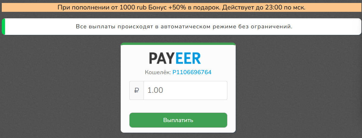 Чтобы получить бонус в размере от +5% и выше, нужно пополнить баланс на сумму от ₽100, а максимальная награда составит +50%. При этом при детальном изучении мы заметили некоторые странности – после регистрации лимит на вывод составляет ₽0.2, в это время деньги автоматически зачисляются на баланс за счет майнинга. Если подождать, пока на счету накопится нужная сумма, то ограничение будет увеличено – уже до ₽1, при этом причины для таких изменений не сообщаются.