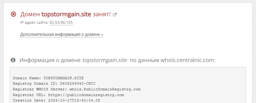 На сайте указано, что проект работает в течение 14 дней – эта информация не является разводом, так как домен зарегистрирован в октябре 2025 года. Исходя из отзывов о TopStormGain, что брокер только недавно вышел на рынок, а это может привести к проблемам с обслуживанием, так как новые проекты часто характеризуются нехваткой опыта и быстро закрываются.