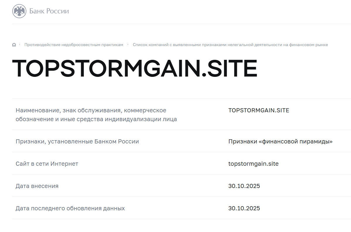 Учитывая, что отзывы о TopStormGain на момент написания материала не найти, мы обратили внимание на предупреждение от Банка России. В реестре надзорного органа организация значится как имеющая признаки финансовой пирамиды, поэтому ей опасно доверять.
