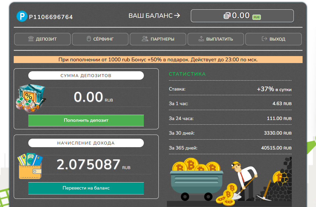 Профиль на сайте выполнен в простом стиле, тут нет никаких инструментов или терминала для торговли – на главном экране можно найти табло, отражающее процесс начисления дохода. Деньги автоматически капают на баланс, для этого не нужно ничего делать – возможно, размер дохода зависит от суммы депозита.