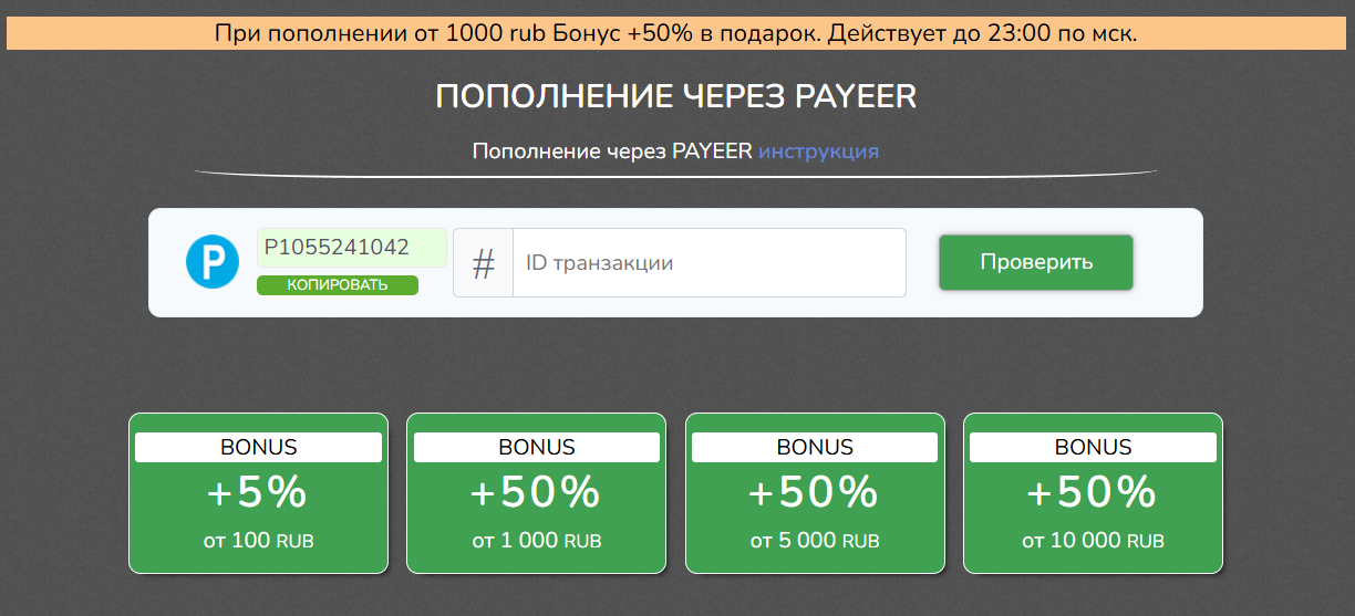 Внесение средств на баланс происходит только через кошелек Payeer, другие платежные системы, исходя из отзывов о TopStormGain, не поддерживаются. Клиенту нужно зайти в свой личный кабинет в рамках цифрового сервиса, а также перевести деньги на номер счета, указанный на сайте брокера – затем скопировать ID транзакции и предоставить его для проверки.