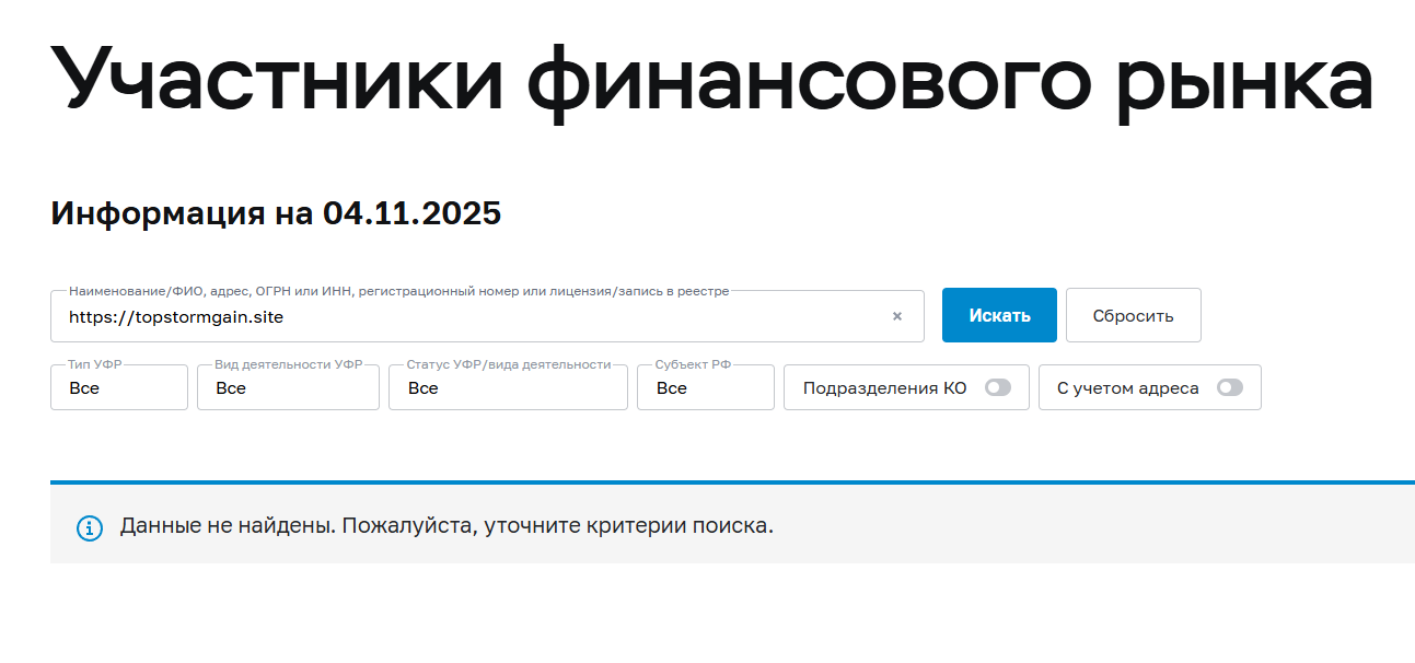 Мы сделали вывод, что проект никем не регулируется, из-за чего риск столкнуться с разводом значительно повышается. Ручная проверка через базы органов не дала результата, название компании нигде не фигурирует, в том числе в России, а отзывов о TopStormGain нет ни у одного проверенного издания.