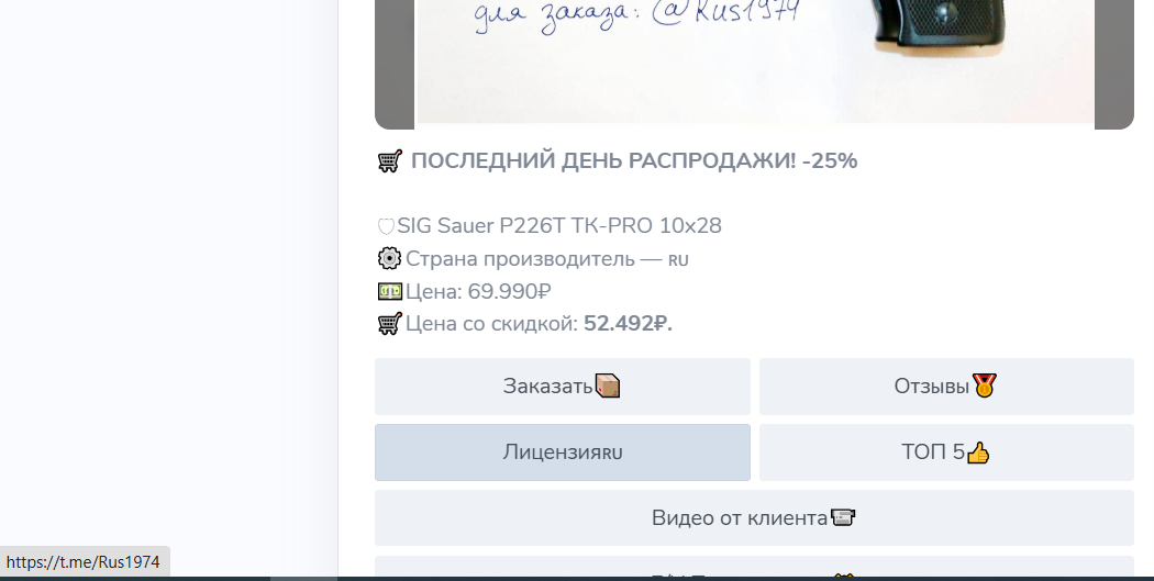 Пользователь Телеграмм с ником Rus1974 предлагает на своем канале разные товары для самообороны по низким ценам, а также предлагает лицензию и гарантии. В этом обзоре расскажем, выгодно ли закупаться в магазине и стоит ли вообще ему доверять.