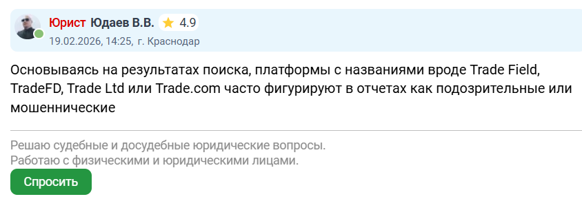 На февраль 2026 года отзывов о бирже не так много, но они характеризуют проект как ненадежный и не заслуживающий доверия. Инвесторы предупреждают жителей России о том, что отсутствие компании в реестре ЦБ РФ – уже веская причина обойти площадку стороной.Авторы отзывов замечают, что в обсуждениях Trade Field часто фигурируют и другие биржи вроде TradeFD, Trade Ltd. Другими словами, проекты часто связывают воедино, намекая на одну и ту же группу мошенников.
