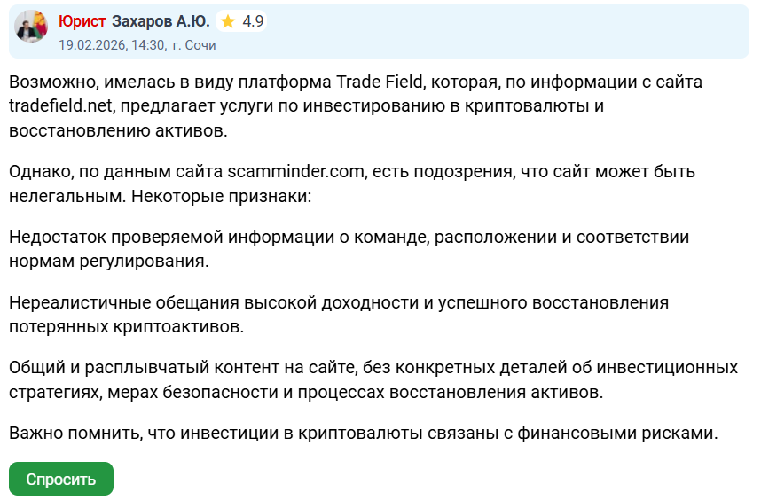 Также часто упоминают нереалистичные обещания биржи TradeField вроде сверхвысокой доходности без просадок и быстрого восстановление потерянных криптоактивов.