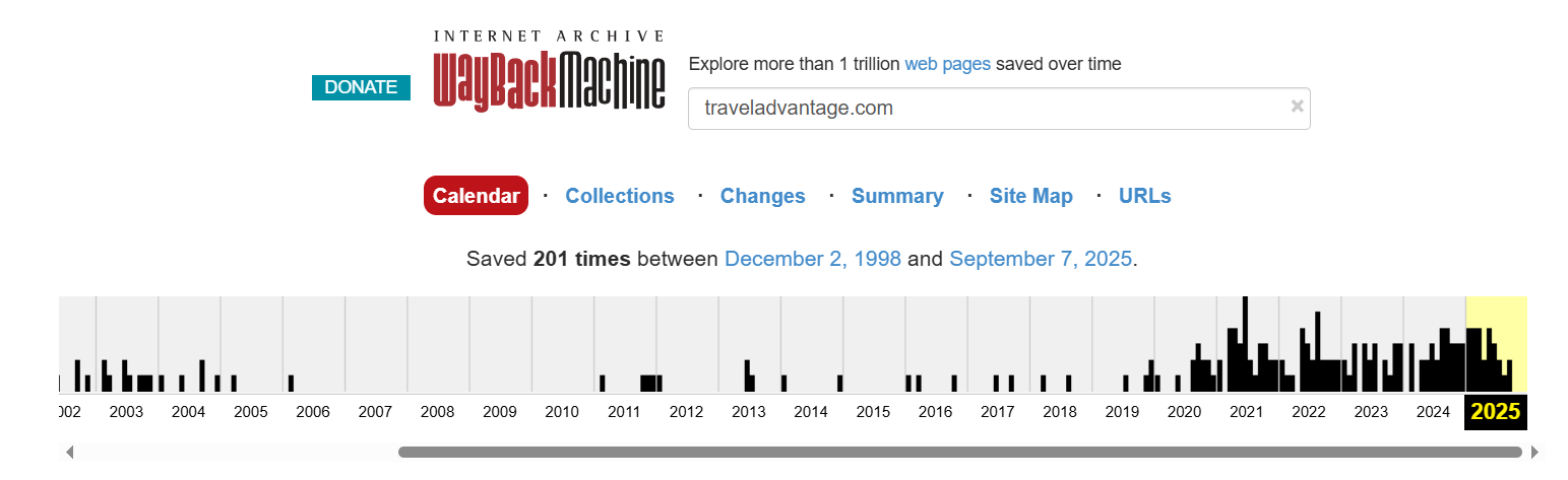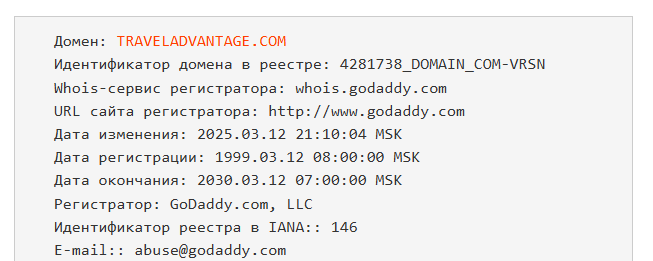 На сайте TravelAdvantage com есть только форма авторизации и никакой информации нет, а чтобы зарегистрироваться, нужно обратиться в поддержку, причем домен создан еще в 1999 году.С другой стороны, если изучить снимки на Web Archive, окажется, что довольно продолжительный период имя пустовало.