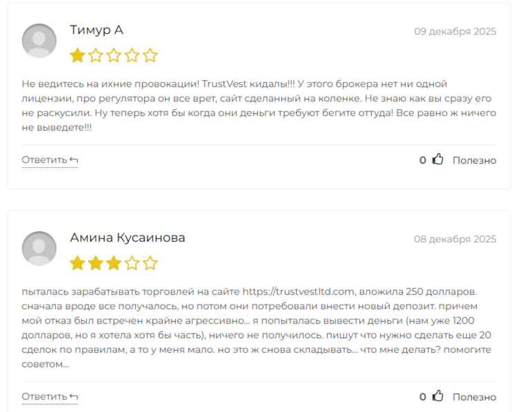 Наша команда обнаружила в сети позитивные комментарии о деятельности посредника. Размещены положительные отзывы на сайте trustvestltd com. Они не вызывают никакого доверия, так как могут быть написаны администрацией портала.