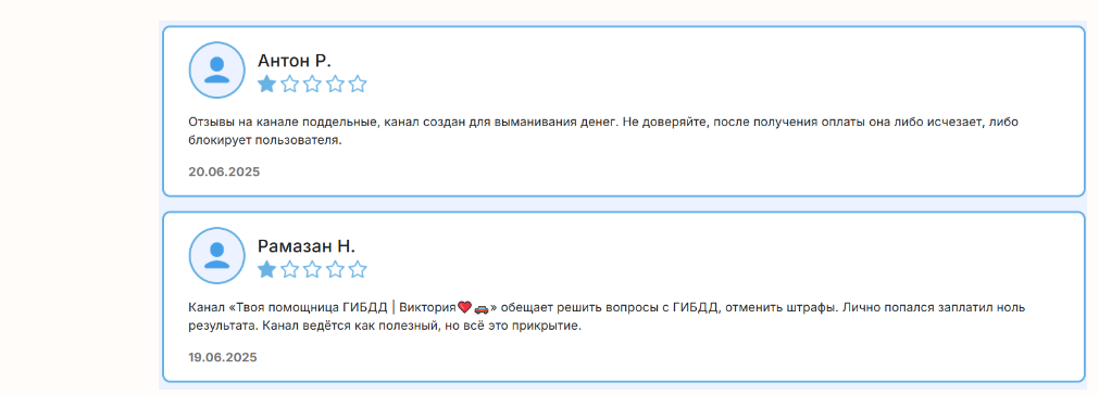 Про потерю денег, переведенных мошенникам ТГ канала «Твоя помощница ГИБДД Виктория», отзывы в разных социальных сетях люди пишут регулярно. Оплаченную услугу по получению получении водительского удостоверения никто не получил.