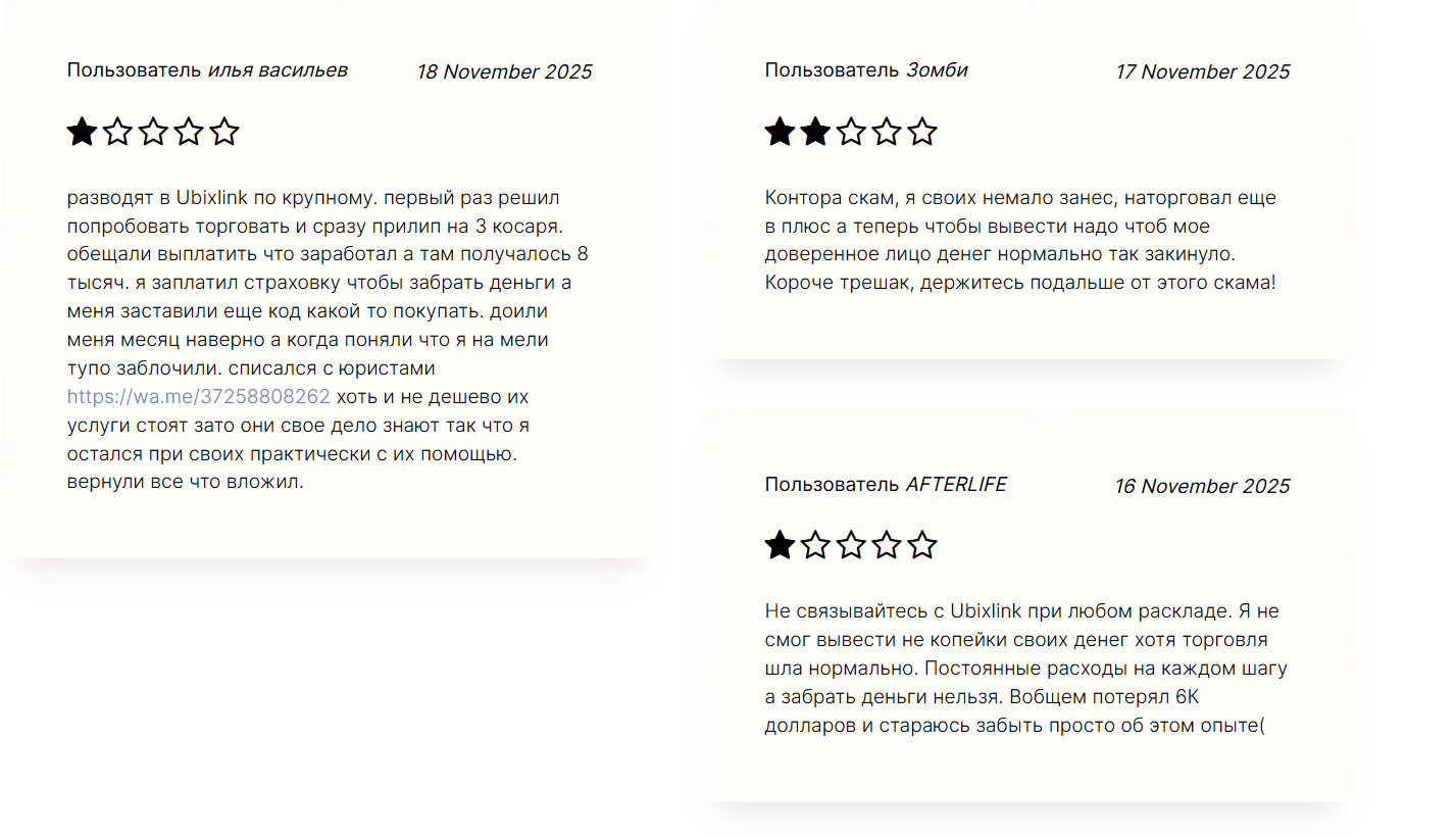 Мы советуем избегать любых услуг Ubixlink. Если вы уже взаимодействовали с этим брокером и столкнулись с проблемами, поделитесь своим опытом в комментариях.