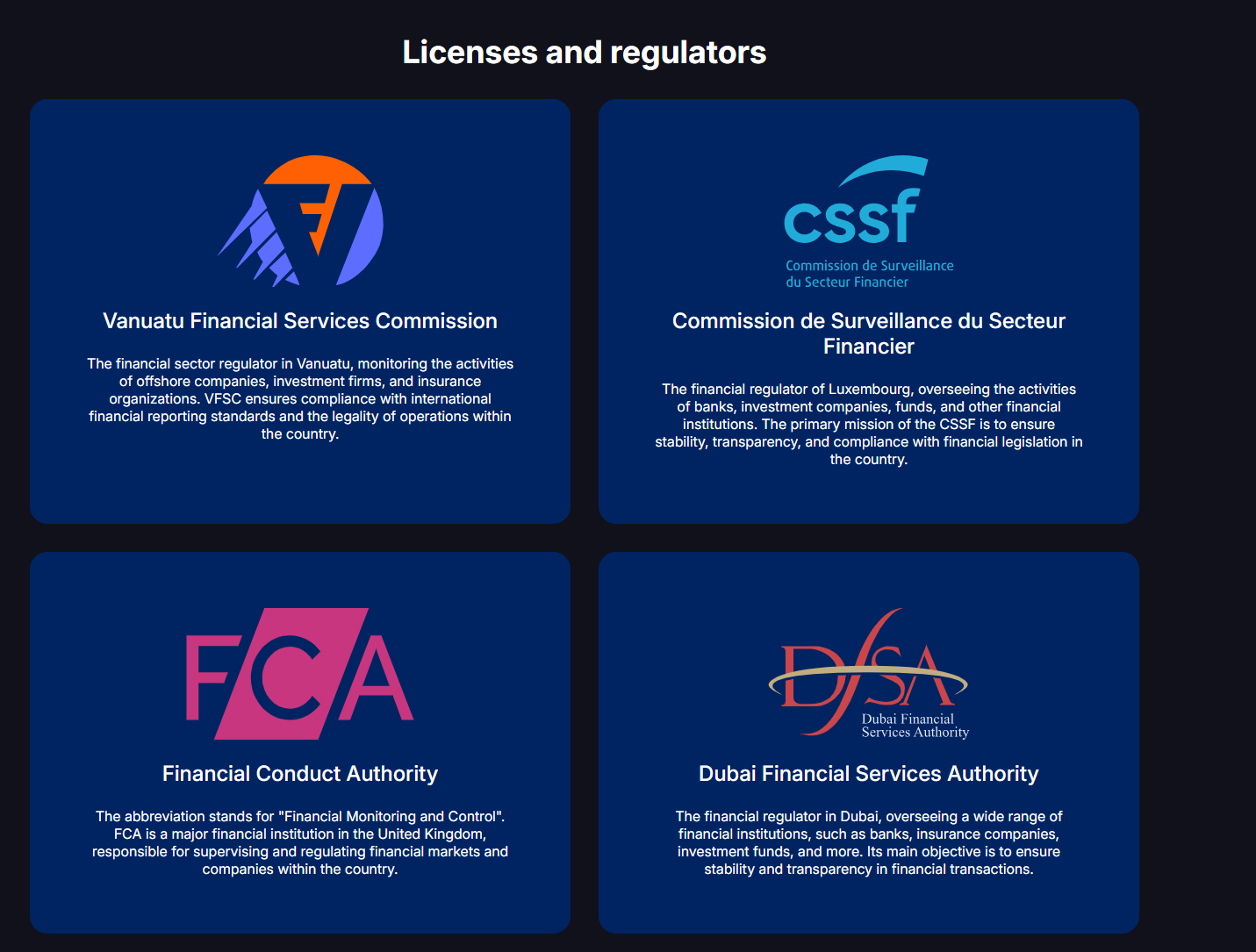 - отсутствие реальных лицензий от VFSC, DFSA или других регуляторов;