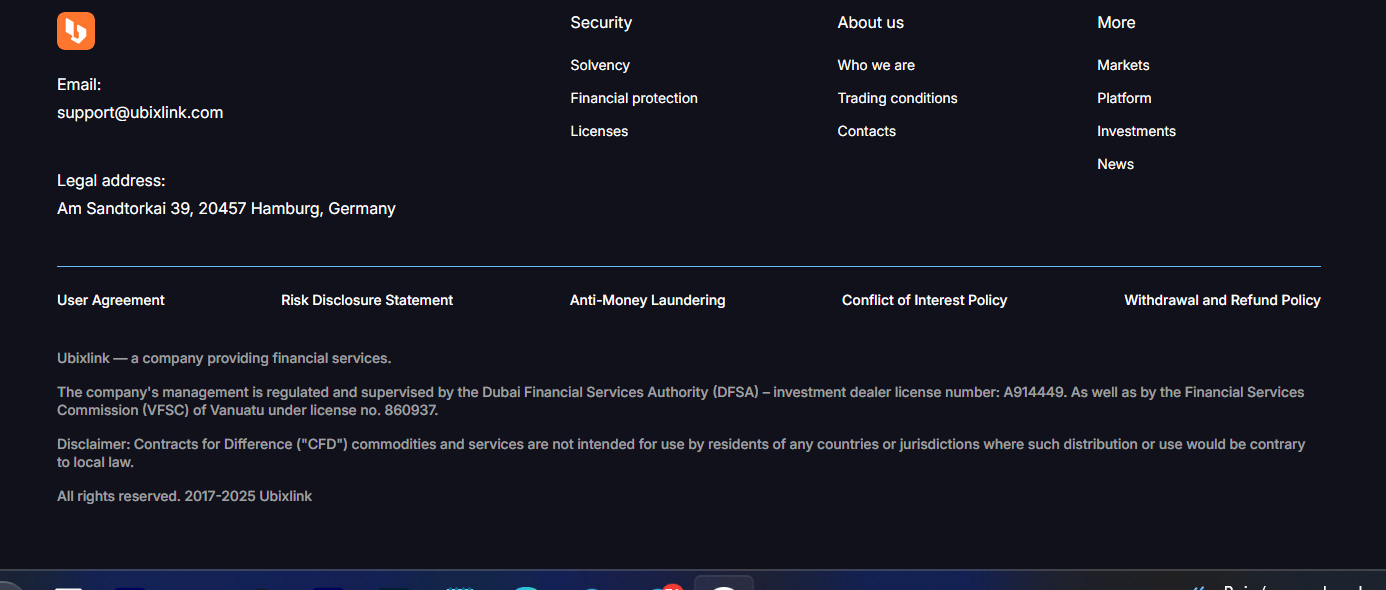 Ubixlink является брокерской компанией, которая зарегистрирована в Германии по адресу Am Sandtorkai 39, 20457 Hamburg. Заявлен опыт работы около 8 лет, начало деятельности произошло якобы в 2017 году. Однако домен ubixlink com был зарегистрирован только в апреле 2021 года, а активное использование сайта началось в 2025 году.