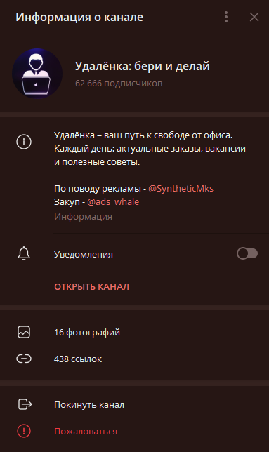 Как говорилось ранее, «Удалёнка: бери и делай» имеет широкую аудиторию,а именно ≈63 000 подписчиков.