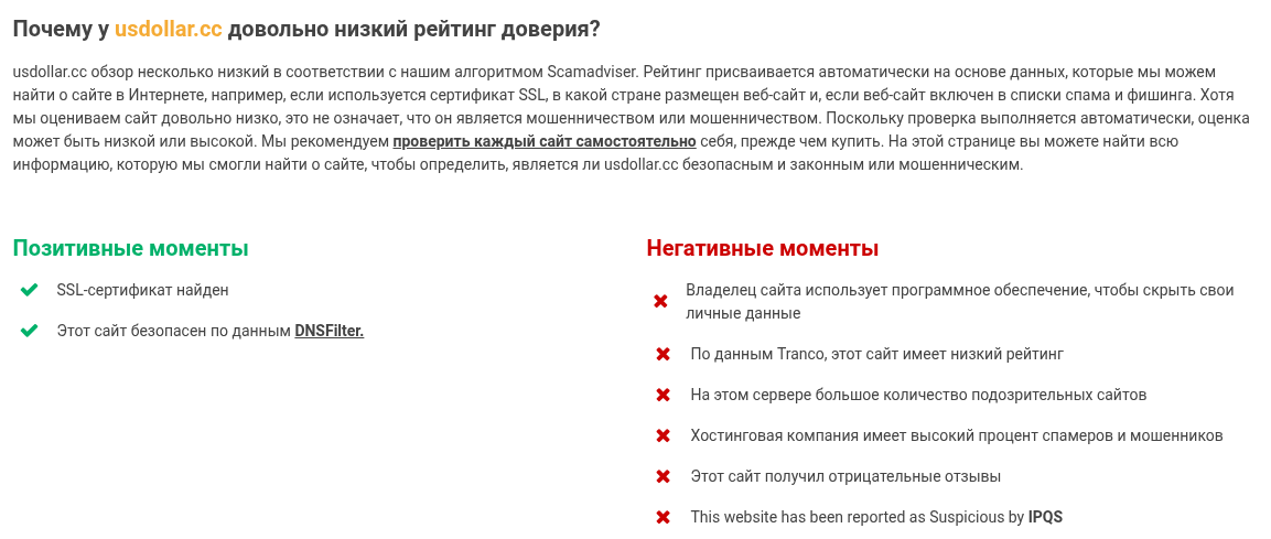 У проекта usdollar cc есть полный набор характеристик мошеннического ресурса: