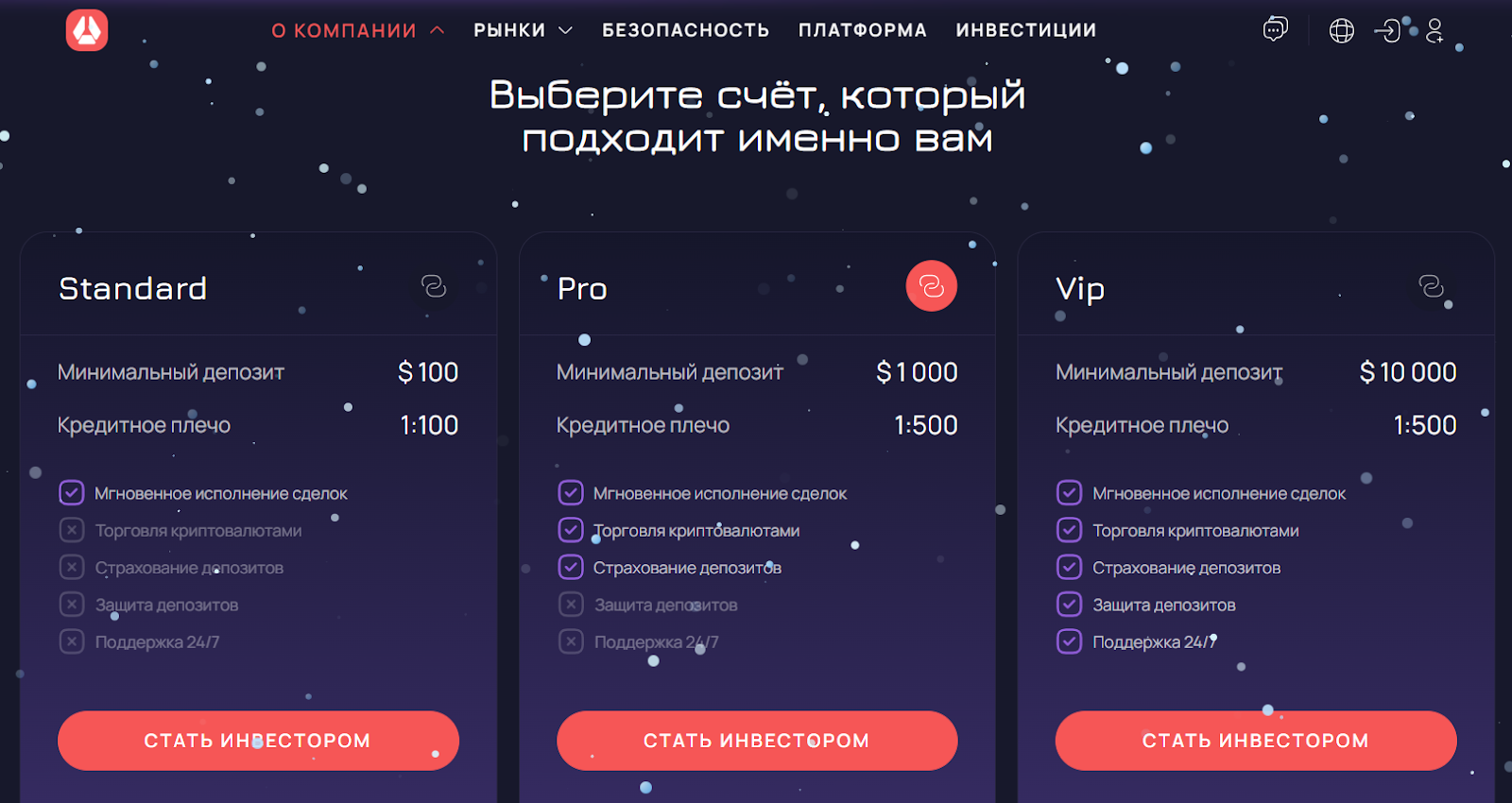 • Standard – минимальный депозит от $100, кредитное плечо 1:100. Подходит для новичков, из заявленного есть только мгновенное исполнение сделок, без допзащиты и расширенной поддержки.