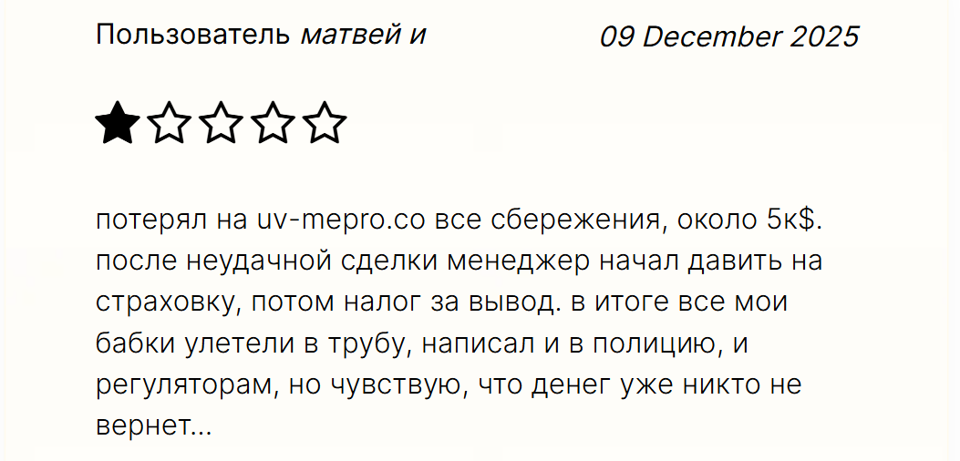 • Отзывы об Uvmepro негативные, так что клиенты лишь подтверждают подозрения на мошенничество.