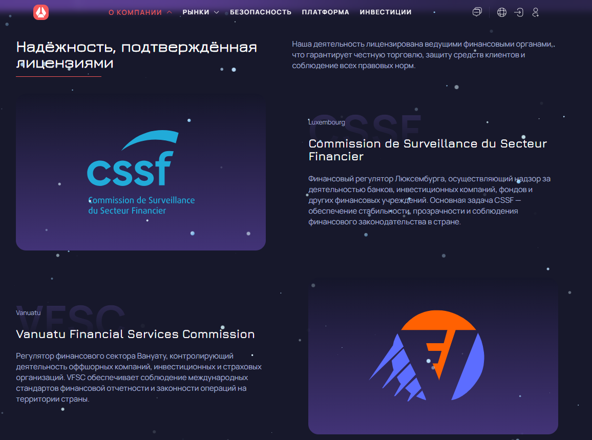 Для гарантий клиентам на платформе рассказывают о нескольких лицензия от популярных регуляторов, но почему-то среди них нет CySEC, хотя сама компания кипрская.