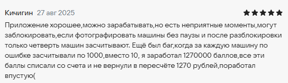 Участник квеста по фотографированию машин с ником Кичигин указывает в отзыве, что далеко не все фотографии принимаются модераторами, а за некоторые приходят баллы ниже ожидаемых, а следовательно уменьшается и оплата.
