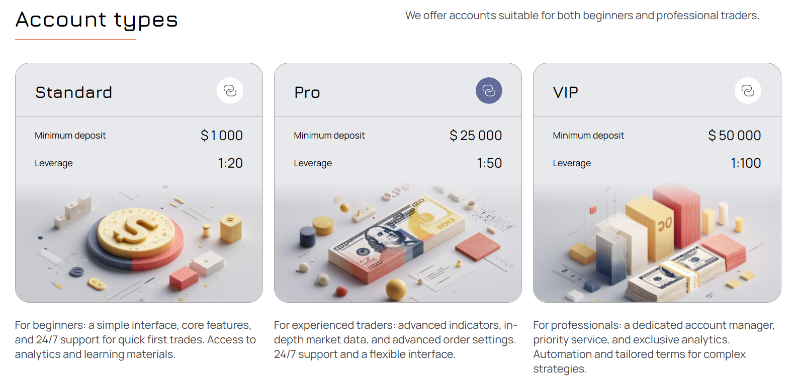 • VIP – наиболее дорогой вариант для профессионалов с депозитом от 50 тысяч долларов и плечом от 1:100, что открывает доступ к личному менеджеру, аналитике и специальному комплексу стратегий.
