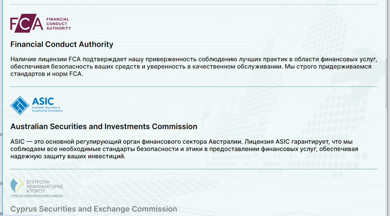 Лицензионным документам посвящен целый раздел. В нем перечислены все международные регуляторы. Однако нет скринов лицензий или разрешений для данного брокера.