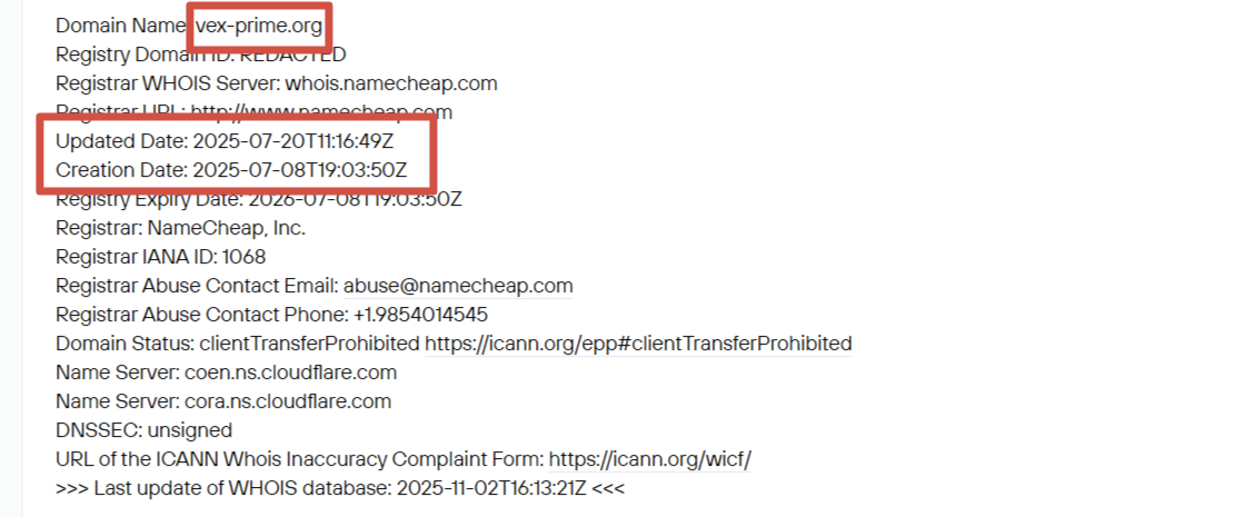 На официальном сайте компании расположена информация об условиях сотрудничества, способы связи и общие сведения о брокере. В футере содержится пользовательское соглашение, номер лицензии и дата начала деятельности– 2017 год. Проверка на специализированных сервисах установила, что домен vex prime org создан только летом 2025 года. Это означает, что владельцы обманули об истинном возрасте компании.