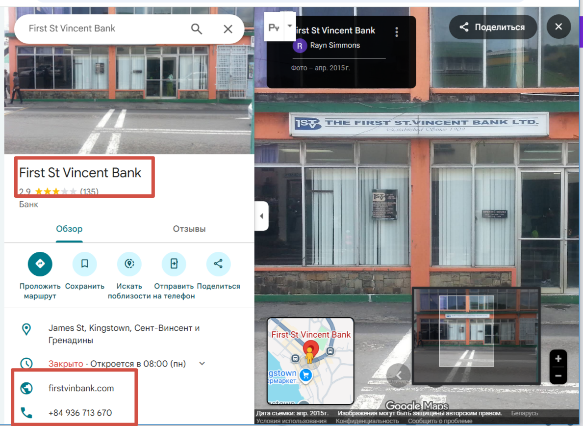 Не меньше проблем будет у клиентов, которые решат посетить головной офис компании. По указанному адресу расположен один из старейших банков в Сент Винсент и Гренадинах. У него совершенно другой сайт, действующая почта и настоящие лицензии.