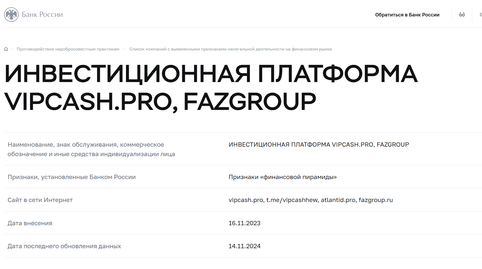 Дата регистрации Vipcash pro соответствует первым публикациям в тг-канале и упоминаниям в социальных сетях, где платформа начала продвигаться как инвестиционный инструмент. Внесение в черный список ЦБ РФ произошло 16 ноября 2023 года.