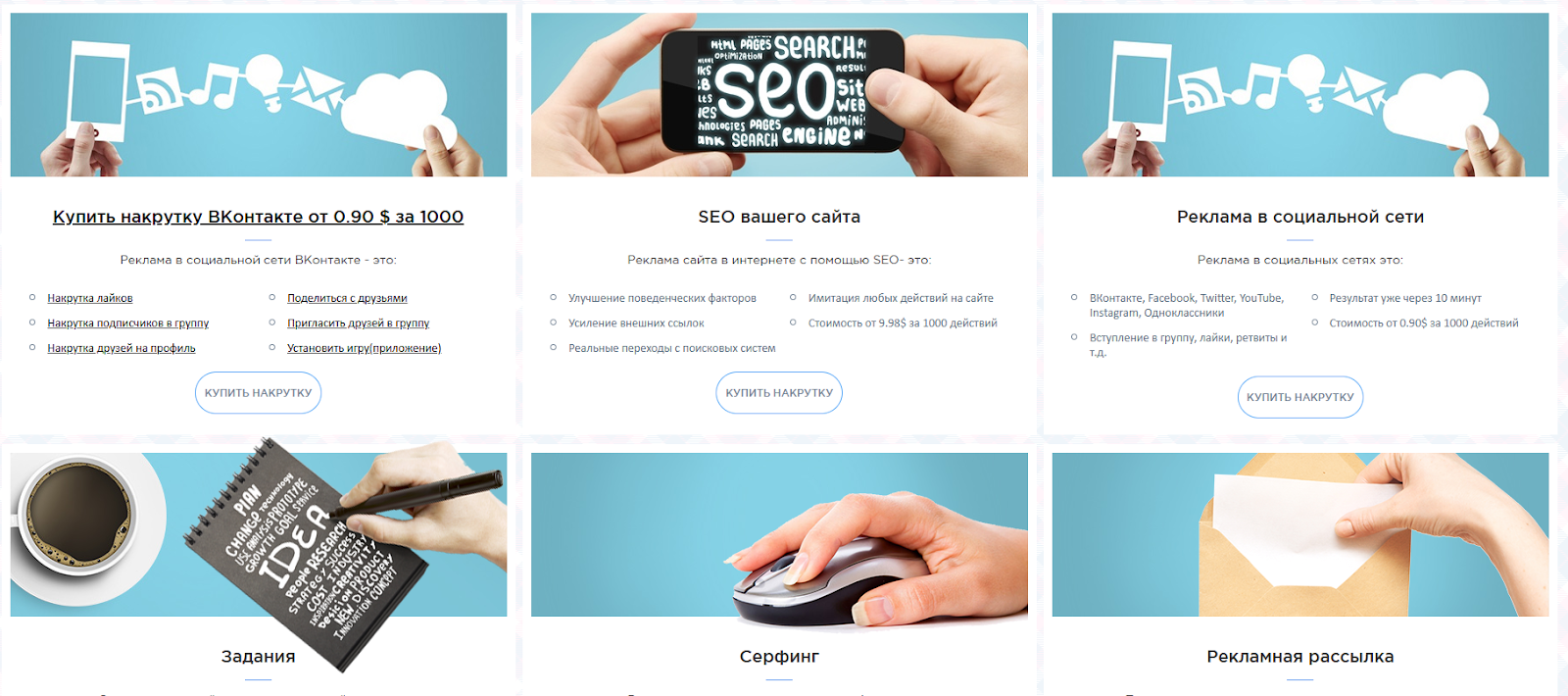 Корпоративным клиентам предлагают инструменты для раскрутки аккаунтов или страниц в соцсетях. На сайте можно централизованно закупить рекламу, комментарии, лайки для Instagram, VK, Facebook, X.