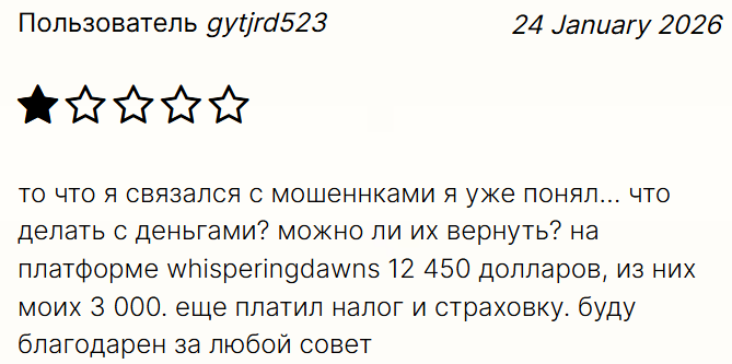 В интернете уже появились отзывы о том, как работает брокер Whisperingdawns, все они отрицательные. Клиенты подтверждают, что у них забирали деньги.