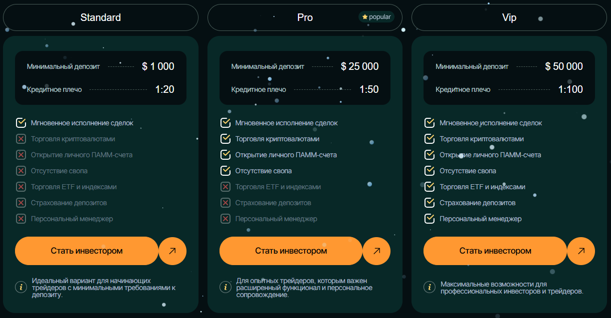 Минимальный депозит у брокера Whisperingdawns составляет $1000. За такую сумму клиент может рассчитывать на единственную опцию: мгновенное исполнение сделок. За сумму от $25 000 обещают возможность торговать без свопа, открывать свои ПАММ-счета, доступ к крипторынку.
