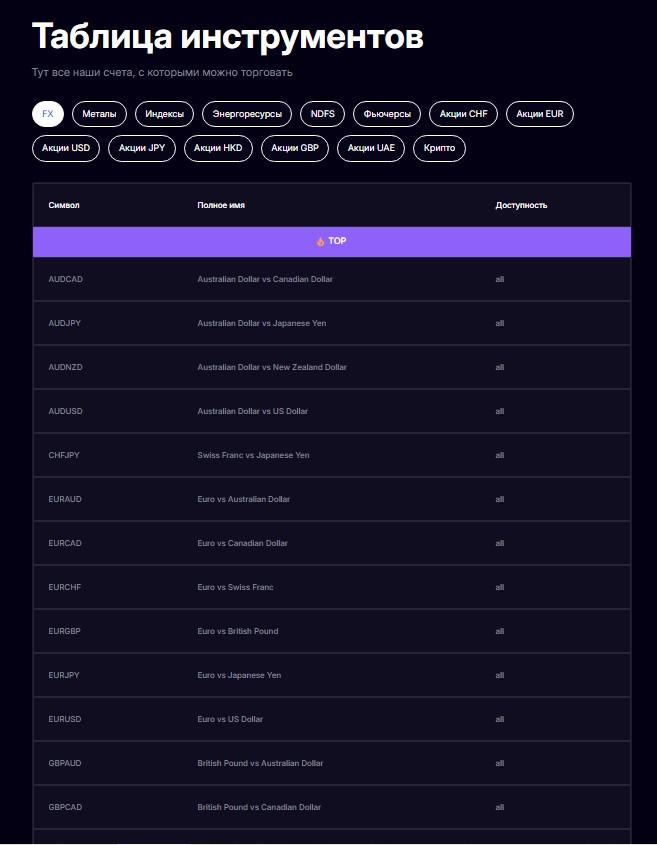Торговать можно криптовалютами, акциями, металлами, индексами, энергоресурсами, фьючерсами и на рынке Форекс. Полный перечень активов, доступных для сделок, представлен в разделе сайта «Таблица инструментов».