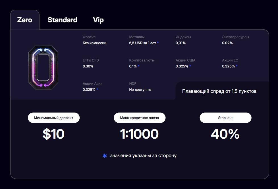 - Zero: вклад от 10 долларов, кредитное плечо – 1:1000;