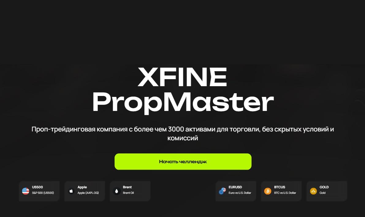 Еще брокер создал про-трейдинговую компанию XFINE PropMaster. Она дает трейдерам деньги для торговли активами, взимая с дохода определенный процент. Но получить финансирование может не каждый. Сначала нужно пройти несколько этапов отбора, чтобы доказать свой опыт и профессионализм в трейдинге.