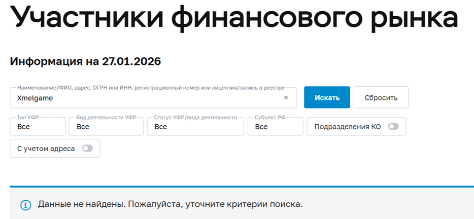 В сети есть информация о мошенничестве X Mel Game. Компания юридически не зарегистрирована, поэтому у нее нет официальной лицензии от Центробанка РФ. Значит, прием денег от пользователей считается незаконным. При возникновении финансовых сложностей у клиентов нет правовой защиты.На сайте Xmelgame указано о длительной работе компании, которая якобы заслужила положительную репутацию среди пользователей. На самом деле доменный адрес этого сервиса зарегистрирован в конце 2025 года, поэтому считать площадку опытной нельзя. На сегодня известно, что домен продлен до 07.12.2026 г.