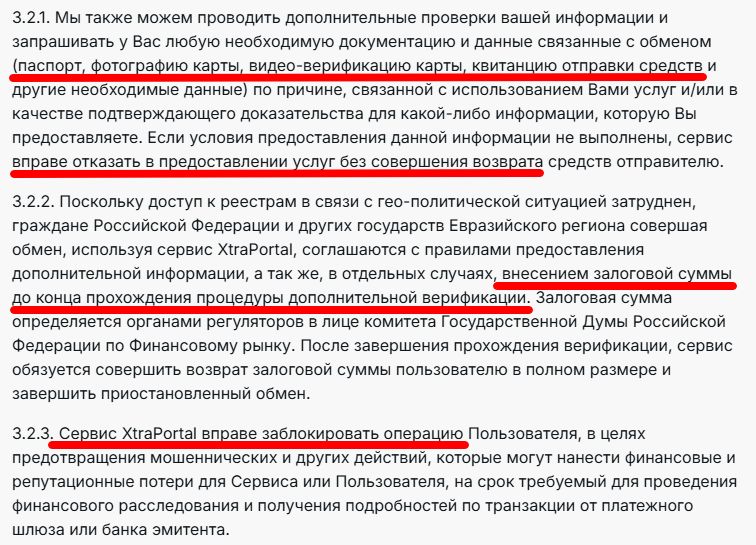 Страниц в соцсетях XtraPortal также не имеет. Из контактов указан лишь телеграм-чат поддержки XtraPortal Support. Операторы работают каждый день с 10 до 10 по «местному времени».Правила XtraPortal содержат откровенно мошеннические условия. Начнем с того, что сам документ не является подлинным – правила скопированы у других мошеннических обменников, на которые мы выпускаем обзоры. В частности, пункты 3.2.1-3.2.3 содержат ряд таких условий, в которых XtraPortal наделяет себя правом требовать залог и личные данные клиента, не соблюдая политику KYC.