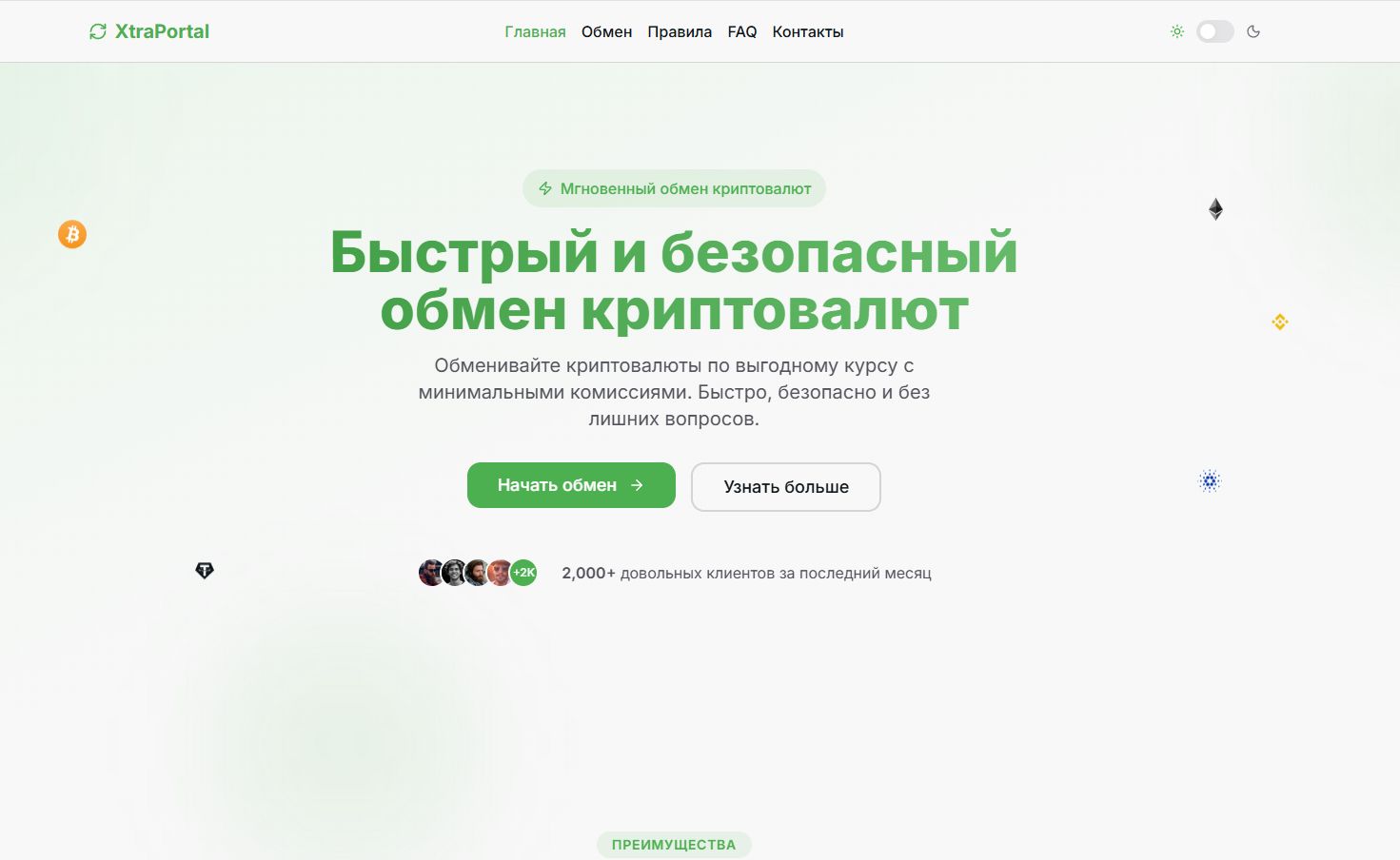 Официальный сайт xtraportal.com выглядит аккуратно, минималистично. В меню доступны разделы «Главная», «Обмен», «Правила», «FAQ», «Контакты».