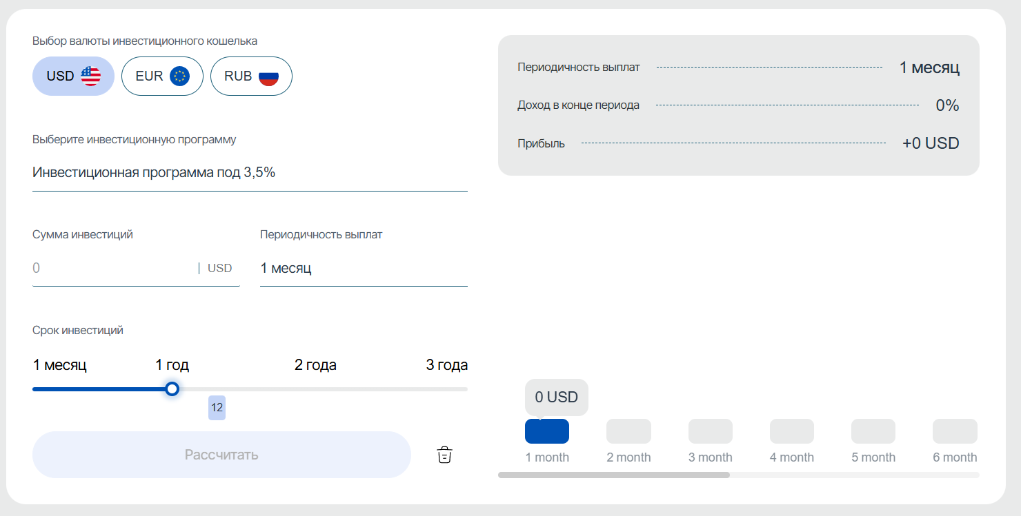 Также тут предлагаются условия для инвестирования. Стандартной ставкой является 3,5% в месяц. Это обещает обеспечить пассивный заработок без рисков, что привлекает многих новичков. Такие показатели очень высокие, поэтому не вызывают доверия. Для более удобного расчета тут предоставляется калькулятор дивидендов.
